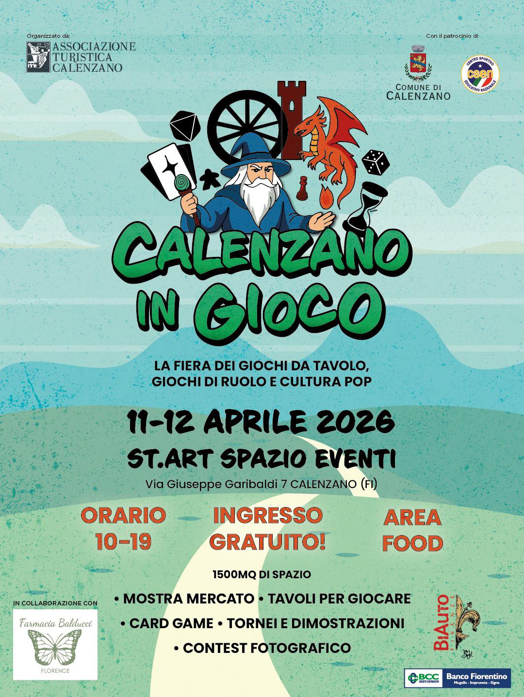 Si svolge per la prima volta a Calenzano "Calenzano in gioco", la prima fiera ludica del nostro territorio organizzata da Associazione Turistica Calenzano per sabato 11 e domenica 12 aprile 2026, ore 10-19, presso il centro St.Art Eventi, in via Garibaldi 7. La fiera prevede la presenza di più di 20 espositori con mostra mercato, tavolli per giocare e tavoli con dimostrazioni, conferenze e anche un concorso fotografico. Ci sarà, inoltre, anche un'area ristoro.