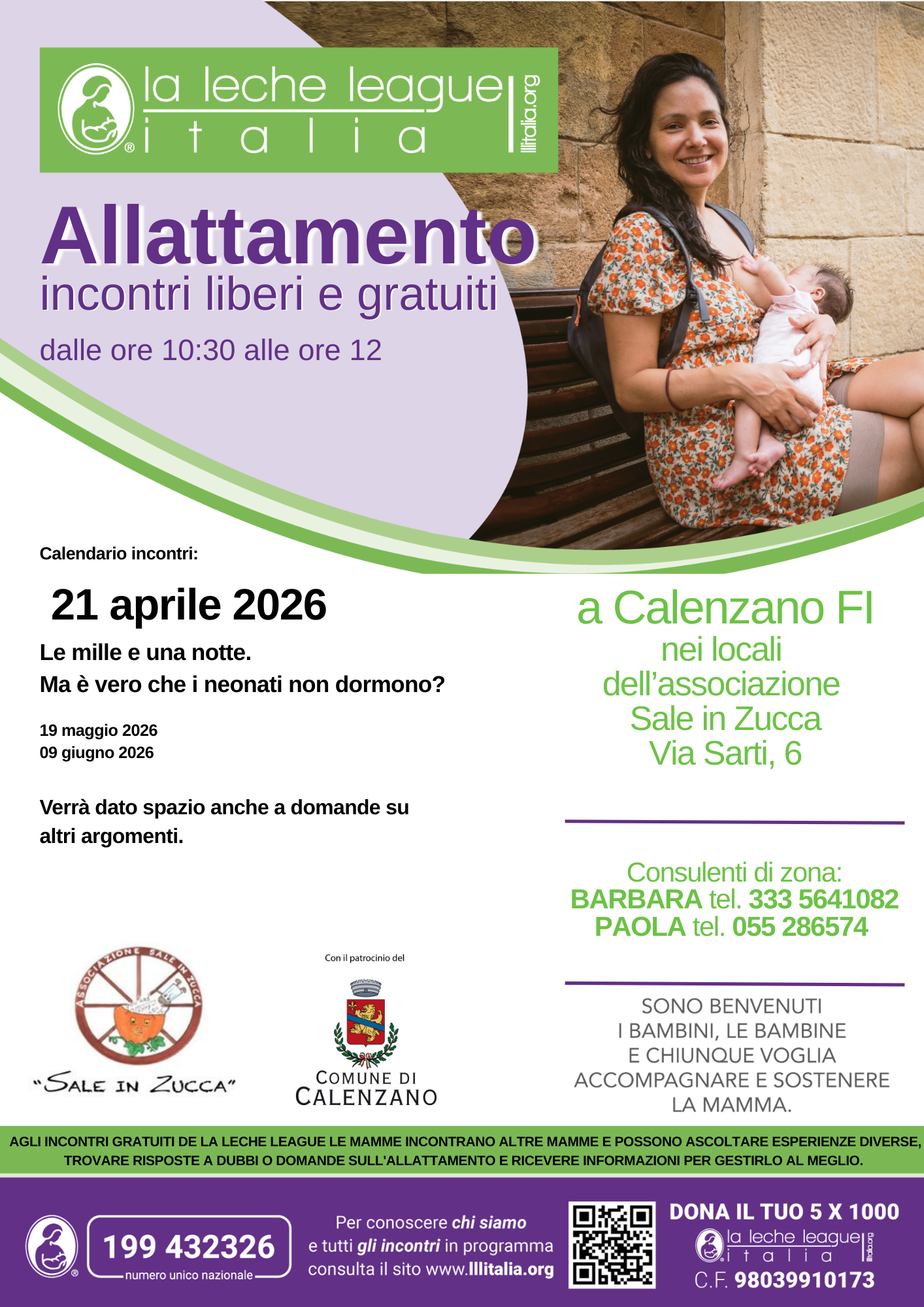 - Il sesto incontro, sul tema Le mille e una notte. Ma è vero che i neonati non dormono?, è stato organizzato per martedì 21 aprile 2026 dalle 10:30 alle 12:00 nella sede dell'associazione Sale in Zucca in Via P. Sarti n. 6 a Calenzano.
